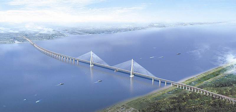 滬通長江大橋是新建的滬通鐵路全線的控制性工程,全長約11公里,采用公鐵兩用、雙塔斜拉橋施工,主跨1092米,比此前的世界第一斜拉橋蘇通大橋主跨長4米,具有“一高、二大、三新”的特點。一高即主塔高:大橋主塔高325米,為世界最高公鐵兩用斜拉橋主塔;二大即大跨度和大體積:大橋主跨1092米,建成后將是世界最大跨度公鐵兩用斜拉橋,專用航道橋主跨336米,是目前世界上同類型結構中最大跨度的公鐵兩用鋼拱橋。