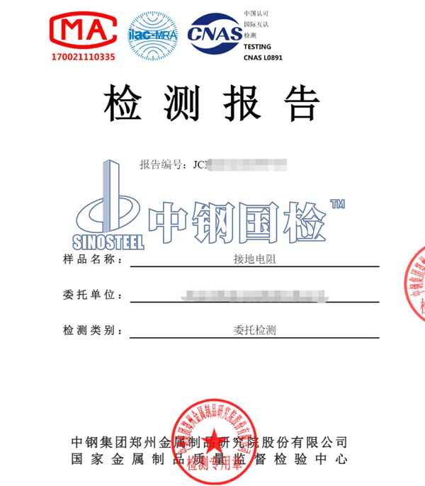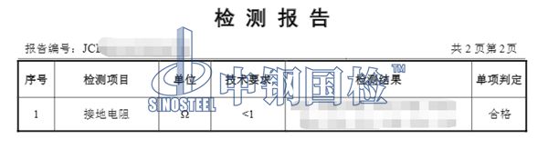 中鋼國檢擁有符合標準要求的專業(yè)實驗室,可以保證檢測數(shù)據(jù)的準確性。中鋼國檢的服務(wù)群體已經(jīng)覆蓋全國,目前有十多家分公司和34個辦事處在全國各地分布,能做的及時響應(yīng),及時出具報告,并具有CMA/CNAS檢測資質(zhì),檢測報告全國認可。下面是某單位委托中鋼國檢做的接地電阻檢測,詳細內(nèi)容如下: