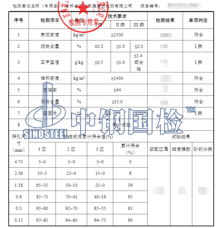 中鋼國檢擁有符合標準要求的專業(yè)實驗室,可以保證檢測數(shù)據(jù)的準確性。中鋼國檢的服務(wù)群體已經(jīng)覆蓋全國,目前有十多家分公司和34個辦事處在全國各地分布,能做的及時響應(yīng),及時出具報告,并具有CMA/CNAS檢測資質(zhì),檢測報告全國認可。下面是某單位委托中鋼國檢做的機制砂檢測,詳細內(nèi)容如下:
