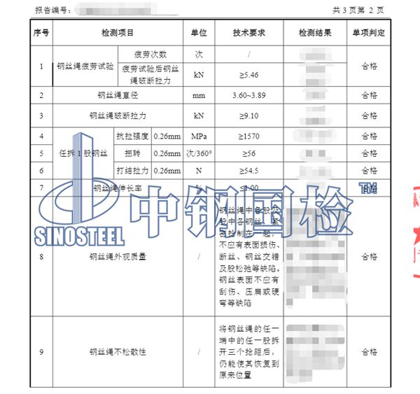 檢測項目:1.鋼絲繩疲勞試驗,2.鋼絲繩直徑,3.鋼絲繩破斷拉力,4.任拆 1 股鋼絲:抗拉強度,5.任拆 1 股鋼絲:扭轉,6.任拆 1 股鋼絲:打結拉力,7.鋼絲繩伸長率,8.鋼絲繩外觀質量,9.鋼絲繩不松散性,10.鋼絲繩平直度,11.鋅層重量。