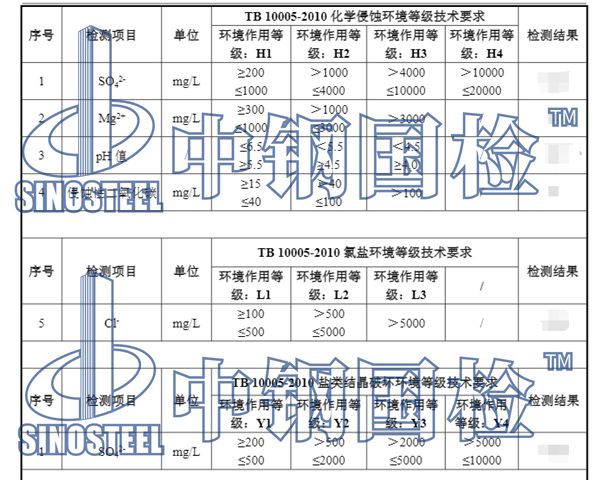 環(huán)境水檢測采用標準TB 10005。在標準中規(guī)定了氯鹽環(huán)境的作用等級中氯離子濃度,化學侵蝕環(huán)境作用等級中pH 值,侵蝕性二氧化碳,Mg2+的含量,鹽類結晶破壞環(huán)境等級中SO42-的含量。
