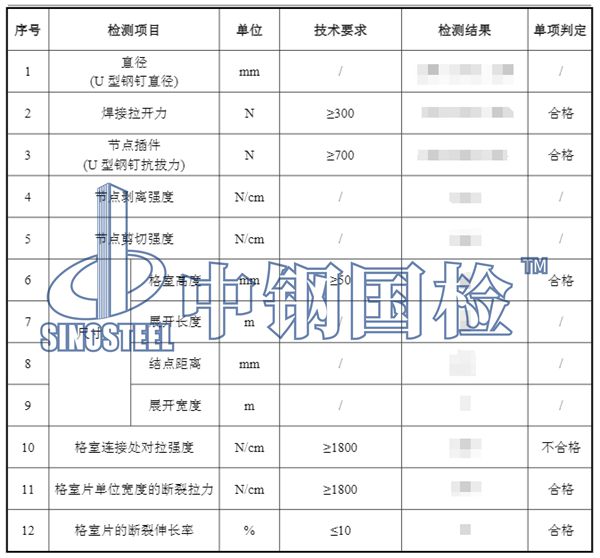 檢測項目 1.外觀,2.尺寸:格室高,3.尺寸:格室片厚,4.尺寸:焊接距離,5.格室片的拉伸屈服強度,6.焊接處抗拉強度。